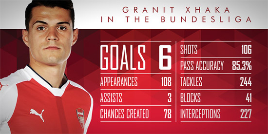 Xhaka hakkında konuşan menajer Arsena Wenger, "Granit Xhaka, heyecan verici genç bir oyuncu. Şampiyonlar Ligi ve Bundesliga tecrübesine de sahip. Uzun süredir takip ediyorduk, bize güç katacak" dedi.