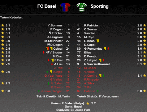 UEFA Avrupa Ligi G Grubu'nda İsviçre ekibi Basel ile Portekiz temsilcisi Sporting Lizbon karşı karşıya geldi. St. Jakob-Park'ta oynanan maçta gülen taraf 3-0'lık skorla ev sahibi Basel oldu.