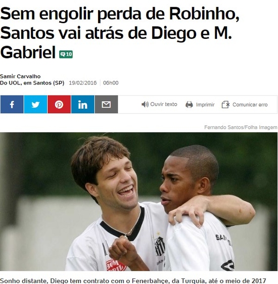 UOL Sport'un haberine göre, Robinho'nun transferini mali rakamlardan dolayı gerçekleştiremeyen Santos, eski oyuncuları Diego ile Al-Nasr Riyadh'tan Marquinhos Gabriel'i renklerine bağlamak istiyor.
