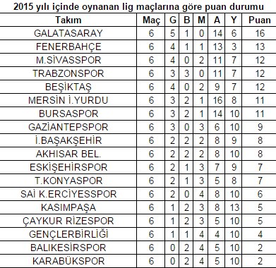 Süper Lig’in 16.hafta maçları ise 2015 yılının ilk günlerinde (3-4-5 Ocak 2015) oynanmış kısa bir aranın ardından 17.hafta maçları ile yarış yeniden başlamıştı. 2015 yılı içinde oynanan 6 haftaya göre puan cetveli yapıldığında ilk sırada Galatasaray yer aldı. Galatasaray bu 6 maçta 5 galibiyet 1 beraberlik alıp 16 puan topladı ve liderliğe oturdu. Fenerbahçe 13 puanla 2. sırada yer alırken Medicana Sivasspor, Beşiktaş ve Trabzonspor 12’şer puanla sıralandı.