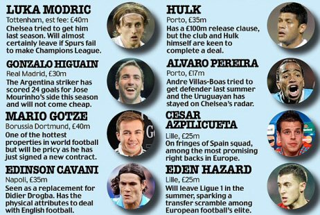Daily Mail'in haberine göre, Rus patron takımın ihtiyacı olduğunu düşündüğü bir forvet, iki savunmacı bir de ofansif orta saha oyuncusu için harekete geçti. Sezon sonunda Roberto Di Matteo ile devam etmesi beklenmeyen Abramovich'in yaz döneminde yaklaşık 300 milyon euroyu transferi ayrıacağı iddia edilirken listede birbirinden önemli yıldızın ismi yer aldı.