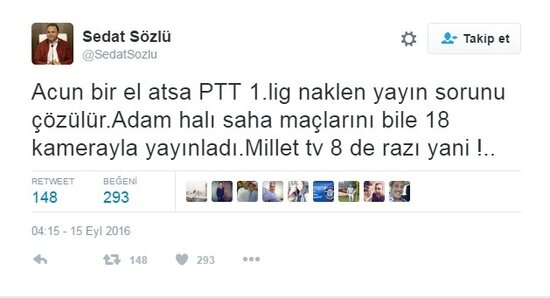 Başkan Sözlü, büyük ilgi gören tweet'inde, "Acun bir el atsa PTT 1. Lig naklen yayın sorunu çözülür. Adam halı saha maçlarını bile 18 kamerayla yayınladı. Millet TV8'e razı yani!" ifadesini kullandı.