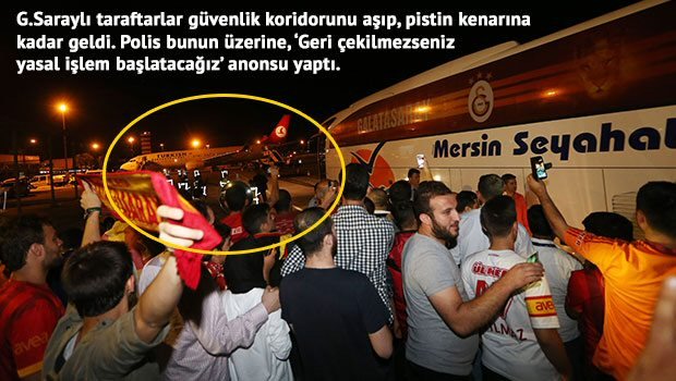 Taraftarlardan yolu boşaltmalarını isteyen polisler, istedikleri yapılmayınca Galatasaray Futbol Takımı kafilesini taşıyan otobüsü havalimanı binasının yanındaki kapıdan direkt uçağa yanaştırdı. Sarı kırmızılılar daha sonra herhangi bir güvenlik kontrolünden geçirilmeden uçağa alındı.Adana polisinin Galatasaray Futbol Takımı'nı taşıyan otobüsü direkt piste alması da taraftarları durduramadı. Güvenlik koridorunu aşan taraftarlar pistin kenarına kadar geldi.