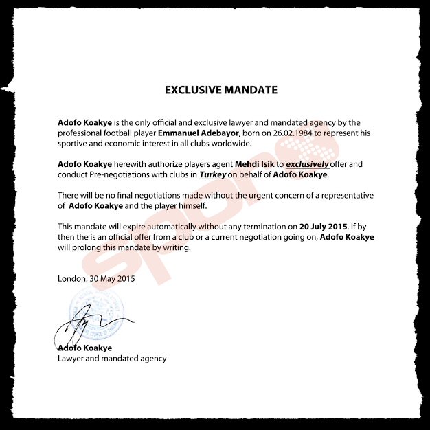 Menajer Işık, Adabayor'un resmi temsilcisi olan Adofo Koakye ile 20 mayıs 2015'de Türkiye haklarıyla ilgili imzaladığı anlaşmayı da sporx.com'la paylaştı.
