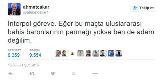 Ahmet Çakar, o iddiasıyla ilgili olarak "İnterpol göreve. Eğer bu maçta uluslararası bahis baronlarının parmağı yoksa ben de adam değilim" dedi.