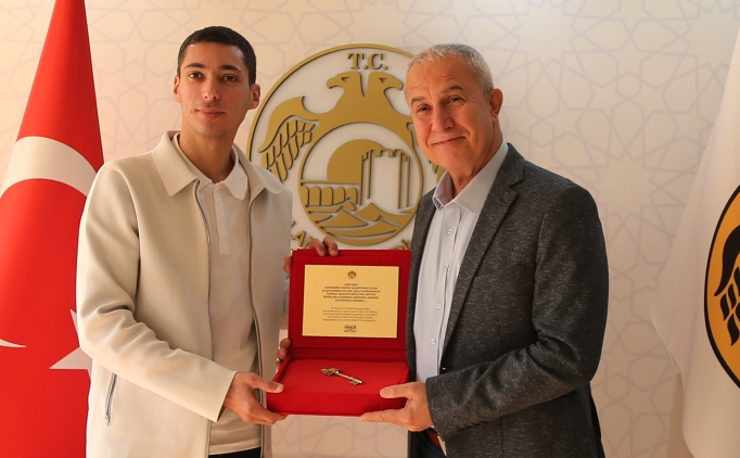 Özçelik, ziyarette Razgatlıoğlu'na "şehrin anahtarı" ile milli sporcunun motosiklet üzerindeki tablosunu hediye etti.