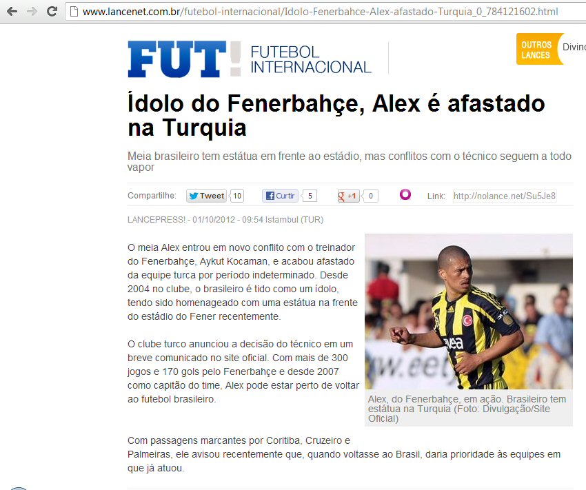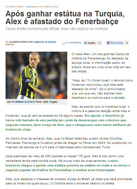 Globo Esporte ise Alex'in kadro dışı kalmasını kulübün yaptığı açıklamayı vererek duyurdu ve Brezilyalı oyuncunun Aykut Kocaman ile sorunlar yaşadığını belirtti. Ayrıca Alex'in Brezilya'daki bir çok kulübün ilgisini çektiğini fakat Coritiba'nın bu takımlar arasında daha önde yer aldığını yazdı.