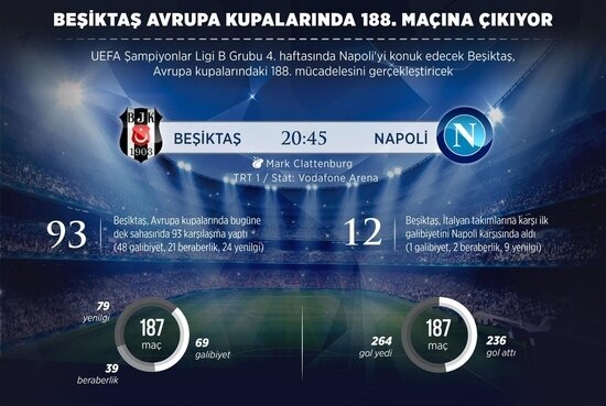 UEFA Şampiyonlar Ligi B Grubu dördüncü haftasında 2 Kasım Salı günü İtalya temsilcisi Napoli'yi konuk edecek Beşiktaş, Avrupa kupalarındaki 188. mücadelesine çıkacak. Siyah-beyazlılar, bugüne dek Avrupa kupalarında yaptığı 187 maçın 69'unu kazanıp 39'unda berabere kalırken, 79 müsabakada ise rakiplerine yenildi. Avrupa arenasında rakip fileleri 236 kez havalandıran Beşiktaş, kalesinde 264 gol gördü. UEFA Şampiyonlar Ligi B Grubu dördüncü haftasında 2 Kasım Salı günü İtalya temsilcisi Napoli'yi konuk edecek Beşiktaş, Avrupa kupalarındaki 188. mücadelesine çıkacak. Siyah-beyazlılar, bugüne dek Avrupa kupalarında yaptığı 187 maçın 69'unu kazanıp 39'unda berabere kalırken, 79 müsabakada ise rakiplerine yenildi. Avrupa arenasında rakip fileleri 236 kez havalandıran Beşiktaş, kalesinde 264 gol gördü.