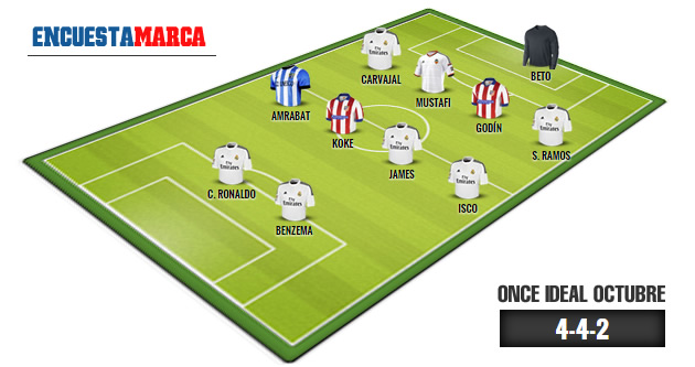 İşte Marca'nın Ekim ayı 11'i; Beto (Sevilla), Sergio Ramos (R.Madrid), Carvajal (R.Madrid), Mustafi (Valencia), Godín (A.Madrid), Isco (R.Madrid), James (R.Madrid), Koke (A.Madrid), Amrabat (Malaga), Cristiano Ronaldo (R.Madrid), Benzema (R.Madrid)