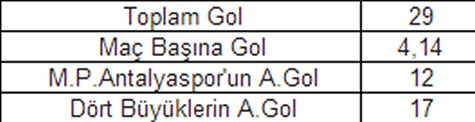 Medical Park Antalyaspor bu sezon dört büyüklerle Süper Lig’de 5 kez, Ziraat Türkiye kupasında 2 kez olmak üzere toplamda 7 kez maç yaptı. Oynanan 7 maçta toplamda 29 gol oldu. Maç başına 4,14 gol atıldı.