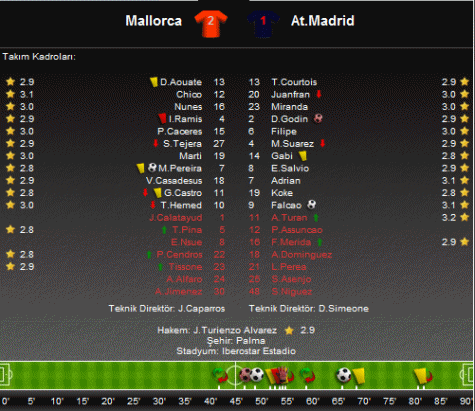Maça yedek kulübesinde başlayan temsilcimiz Arda Turan ise oyuna 59. dakikada Mario Suarez yerine dahil oldu. Bu galibiyetin ardından Mallorca puanını 33'e yükseltirken; Atletico Madrid 36 puanda kaldı.