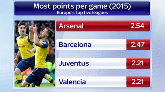 Ligde Chelsea'nin ardından 2. sırada yer alan Arsenal, Premier Lig'de son şampiyonluğunu yaşadığı 2003/04 sezonunda bile bu başarıyı yakalayamamıştı. Son olarak deplasmanda Burnley'i 1-0 mağlup eden Topçular, 2015 yılı içinde oynadığı maçlardan ortalama 2.54 puan alarak Avrupa'da zirveye yerleşti.