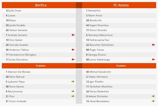 Devler Ligi'nde Galatasaray'ın da yer aldığı C Grubu'nda Benfica evinde Astana ile karşı karşıya geldi. Estadio da Luz'da oynanan mücadeleyi Portekiz ekibi 2-0'lık skorla kazandı.