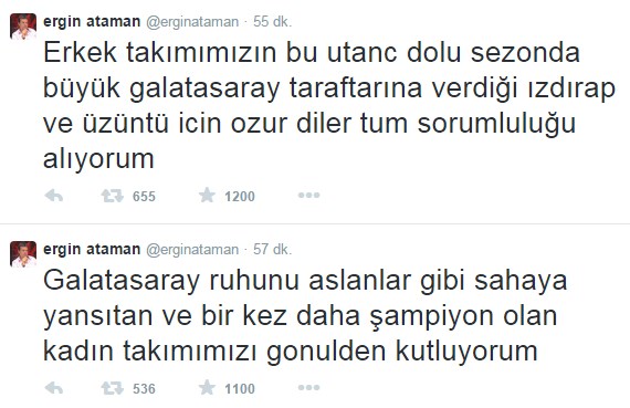 Play-off'a 8. sıradan giren ve Fenerbahçe Ülker ile eşleşen Galatasaray'da sorumluğu üstlendiğini belirten Ataman, "Erkek takımımızın bu utanç dolu sezonda büyük Galatasaray taraftarına verdiği ızdırap ve üzüntü için özur diler, tüm sorumluluğu alıyorum" şeklinde bir tweet attı.