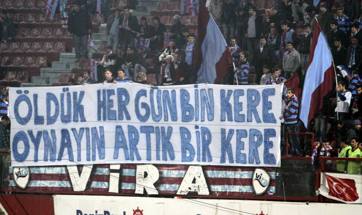 Kale arkası tribündeki taraftarlar, maç öncesi ''Öldük her gün bin kere oynayın artık bir kere'' yazılı pankart açarak tarihinin en kötü dönemlerinden birini geçiren bordo-mavili takımın futbolcularına seslendiler.