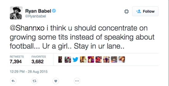 Ryan Babel, bayan bir takipçisinin eleştirisine; "Futbol konuşmak yerine, büyüyen göğüslerine daha fazla odaklanman gerektiğini düşünüyorum. Sen bir kızsın ve kendi alanında kalmalısın" ifadelerini kullanınca büyük tepki aldı.