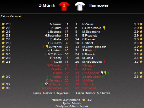 Bundesliga'da 27. hafta maçında Bayern Münih ile Hannover karşı karşıya geldi. Allianz Arena'da oynanan maçta Bayern Münih, rakibini 2-1'lik skorla mağlup etti.