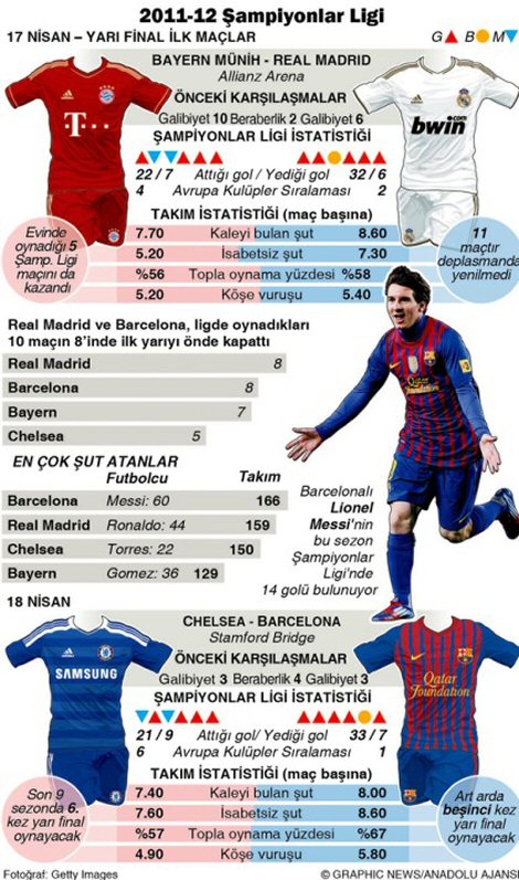 * Bayern Münih, Şampiyonlar Ligi organizasyonunda bugüne kadar 5 kez yarı final oynadı, bunların üçünde finale yükseldi. Kupa 1 olarak bakıldığında ise 13 yarı finali, 8 finali var. Real Madrid ise mücadele ettiği 6 Şampiyonlar Ligi yarı finalinin 3'ünde finale çıktı. Eflatun-Beyazlılar Kupa 1 genelinde ise 22 kez yarı final oynadı, 12 kez final heyecanını yaşadı.