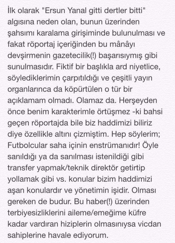 "Selamlar arkadaşlar.Öncelikle mesajlarınız için teşekkür ederim, duygulandırdınız; sağolun varolun... Sizlere veda ederken, aranızdan biri olarak beni çok üzen birkaç başlığa dair duygularımı, düşüncemi ve üzüntümü paylaşmak istiyorum. Geçtiğimiz sezon içinde başlayan,bitimden bir hafta öncesi de süren hatta maalesef hala devam eden haketmediğim eleştirilere ve beni bazılarına hedef haline getiren konuları açıklamak istedim.