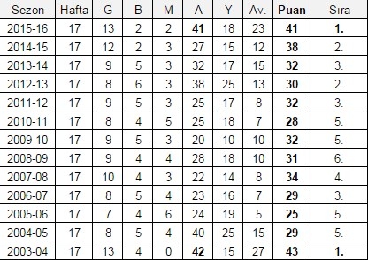 Beşiktaş, Süper Lig’in ilk 17 haftası sonunda 41 puan topladı ve ilk yarıyı lider olarak bitirdi. Beşiktaş Süper Lig’de en son 2003-04 sezonunda 17.haftayı lider olarak geçerken aynı zamanda 40 puan barajını aşmıştı. Sözü geçen sezon Beşiktaş ilk 17 haftada 13 galibiyet 4 beraberlik almış ve 43 puan toplamıştı. Beşiktaş sözü geçen sezonu 3.sırada bitirmişti.