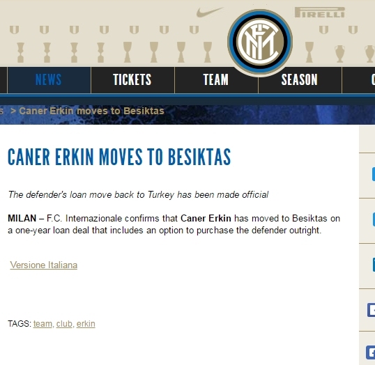 Serie A ekibi Inter de resmi sitesinden Caner'in satın alma opsiyonuyla birlikte Beşiktaş'a kiralandığını açıkladı.