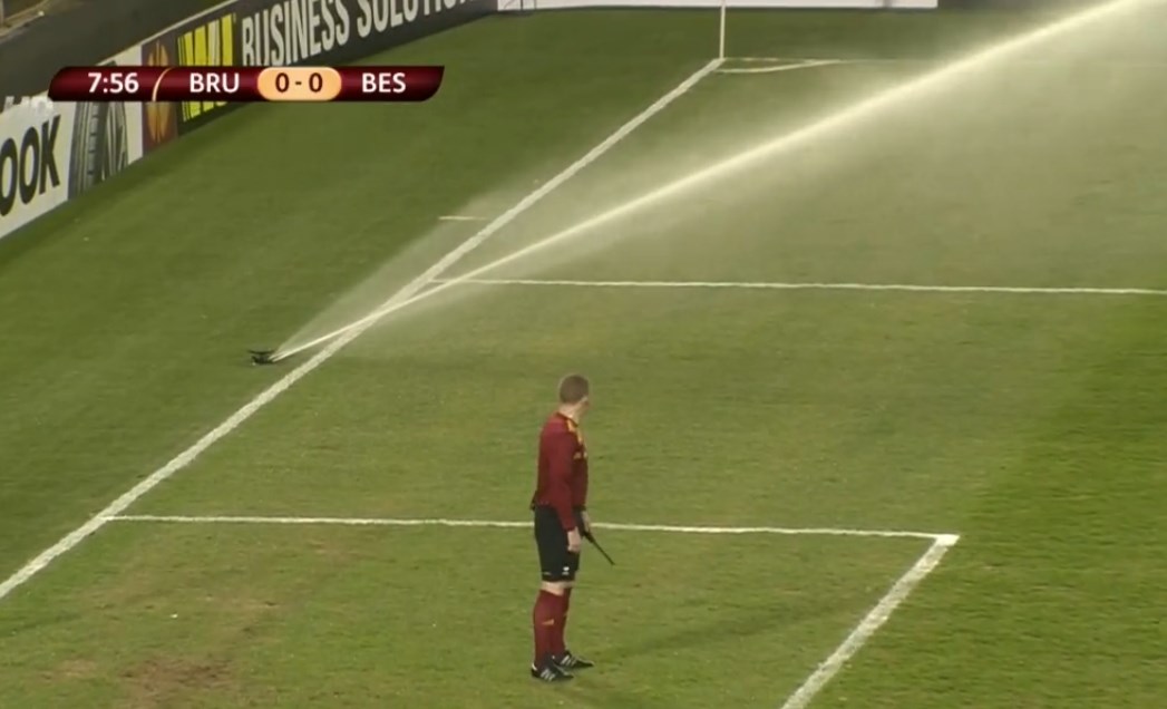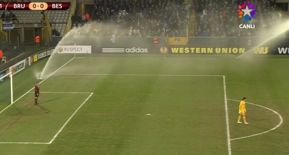 Brugge kale arkasında yer alan çim sulama sistemi birden çalışmaya başladı ve maçın hakemi maçı durdurmak zorunda kaldı. Bir anda ne olduğunu anlamayan futbolcular da olaya gülümsemekle yetindi.