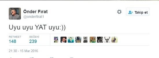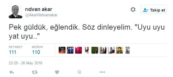 Rıdvan Akar, Fenerbahçeli yöneticiye gönderme yaparak, "Pek güldük, eğlendik. Söz dinleyelim. "Uyu uyu yat uyu.." tweetini attı. Bu tweet Beşiktaşlı taraftarlar tarafından sıkça retweet edildi.