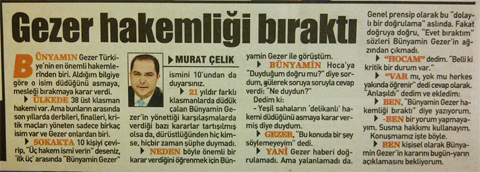 İşte o köşe yazısı:"Bünyamin Gezer Türkiye'nin en önemli hakemlerinden biri. Aldığım bilgiye göre o isim düdüğünü asmaya, mesleği bırakmaya karar verdi.