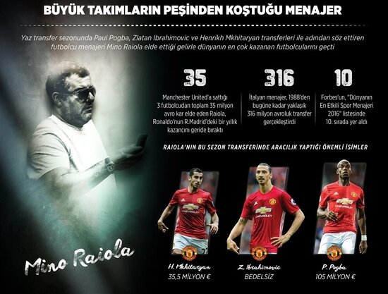 Ünlü menajer bu yıl Paul Pogba, Zlatan Ibrahimovic ve Henrikh Mkhitaryan'ı İngiliz devi Manchester United'a satarak yaz transfer döneminde en çok konuşulan isimlerin arasına girdi. 23 yaşındaki Paul Pogba'yı 105 milyon avroya kırmızı-siyahlı ekibe gönderen Raiola, tarihin en pahalı transferinin gerçekleşmesinde büyük pay sahibi oldu.