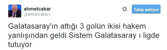 Çakar, maçın hakemi Cüneyt Çakır'ın Galatasaray'ın attığı 2 golde hata yaptığını iddia ederken; "Galatasaray'ın attığı 3 golün ikisi hakem yanlışından geldi.Sistem Galatasaray'ı ligde tutuyor" ifadelerini kullandı.