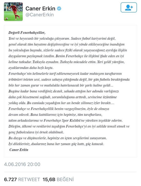 Fenerbahçe'de geçirdiği 6 sezonun ardından bedelsiz olarak Fenerbahçe'den ayrılan ve Inter' ile anlaşan Caner Erkin, twitterdan veda mesajı yayınlamıştı.