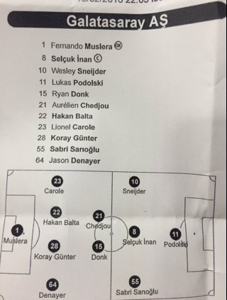 Ön liberoda yeni transfer Ryan Donk ile Aurelien Chedjou'ya görev verildi. Aurelien Chedjou, Denizli'nin göreve gelmesinin ardından Beşiktaş, Akhisar ve Kayserispor maçlarında da ön liberoda oynamıştı.Sabri Sarıoğlu, sağ açıkta formayı kaparken, en uçta Podolski, arkasında ise Selçuk İnan ile Wesley Sneijder yer aldı.