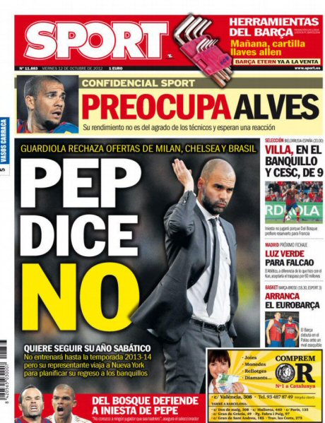 İspanya'nın büyük gazetelerinden olan ve Barcelona kulübüne yakınlığıyla bilinen Sport'un 12 Ekim Cuma günkü sayısında anasayfadan verdiği iddiasına göre; Pep Guardiola Milan, Chelsea ve Brezilya'nın kendisi için yaptığı teklifleri ısrarlı bir şekilde reddetti.