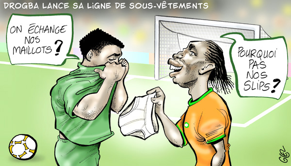 Karikatürde rakip oyuncu, Drogba'ya "Formaları değiştirelim mi?" derken, Drogba'nın ise "İç çamaşırımızı değiştirmeyelim mi?" dediği görüldü.
