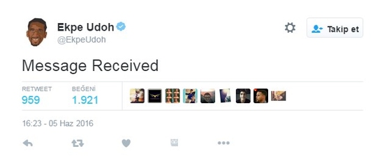 Udoh'un 'Mesaj alındı' tweeti kısa sürede çok sayıda paylaşım gördü.