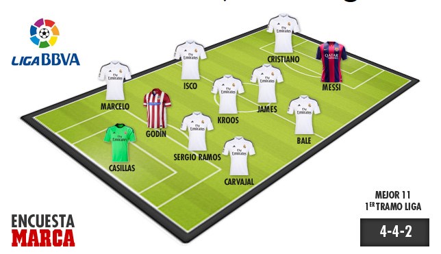 Okuyucular tarafından seçilse de Real Madridli oyuncuların çokluğu ile dikkat çeken 11 isim arasında tam 9 Real Madrid forması giyen isim bulunuyor. Marca'nın ilk yarının en iyi 11'inde Atletico Madrid'den Godin ve Barcelona'dan Lionel Messi de bulunuyor.