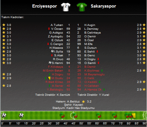 Kayseri Erciyesspor: Ali, Serkan (Dk. 82 Adem), Insa Syalla, Cenk (Dk. 62 Mustafa), Emre, Gökhan, Ramazan , Zafer, Volkan (Dk. 77 Hakan), Wasswa, Hanni