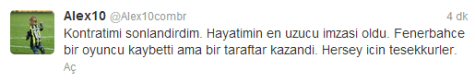 Sarı-lacivertli takımda son dönemde gündemi meşgul eden ve alınan kötü sonuçların ardından kadro dışı kalan Alex de Souza, twitter adresinden yaptığı "Kontratimi sonlandirdim. Hayatimin en uzucu imzasi oldu. Fenerbahce bir oyuncu kaybetti ama bir taraftar kazandi. Hersey icin tesekkurler." ifadelerini kullandı.