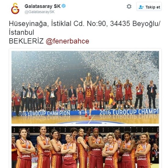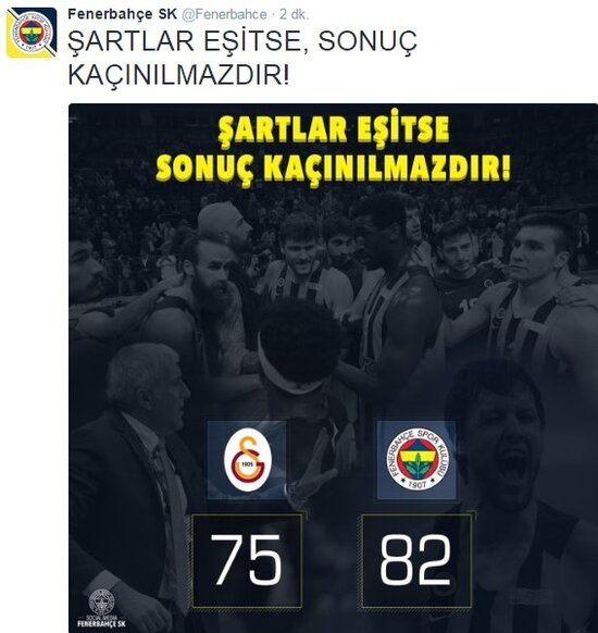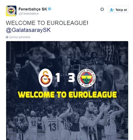 Fenerbahçe'nin, Galatasaray Odeabank'ı 82-75 mağlup ederek finale çıktığı mücadele sonrasında sarı-lacivertlilerin resmi Twitter hesabından rakiblerine gönderme yapıldı.