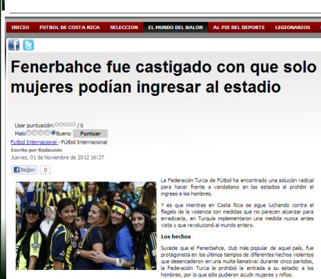 Fenerbahçe'nin geçen sezon aldığı cezadan dolayı ligin ilk 9 haftasında evinde oynadığı maçları sadece kadın ve çocukların izlemesi Dünya basınında da ses getirdi. Kosta Rika'da yayın yapan bir internet sitesi bu olayı satırlarına taşıdı.