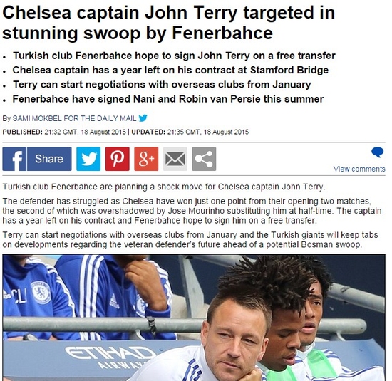 -SPORX DIŞ HABERLER- Transfer döneminin hızlı takımı Fenerbahçe ile ilgili İngiltere'den flaş bir iddia geldi. Sarı-lacivertlilerin, Chelsea'nin İngiliz yıldızı John Terry için flaş bir teklif hazırladığı belirtildi.