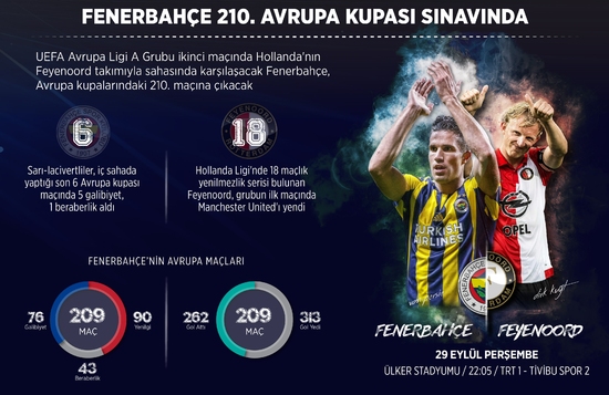 UEFA Avrupa Ligi A Grubu ikinci maçında yarın Hollanda'nın Feyenoord takımıyla sahasında karşılaşacak Fenerbahçe, Avrupa kupalarındaki 210. maçına çıkacak.