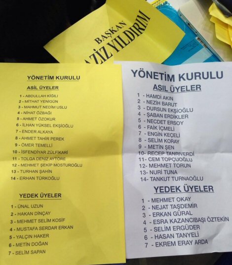 Aziz Yıldırım, seçim sabahı listesini açıkladı. İşte asil üyeler; Abdullah Kiğılı, Mithat Yenigün, Mahmut Uslu, Nihat Özbağı, Ahmet Özokur, İlhan Ekşioğlu, Ender Alkaya, Tahir Perek, Ömer Temelli, İsfendiyar Zülfikari, Deniz Aytöre, Şekir Mosturoğlu, Turhan Şahin, Erhan Türkoğlu