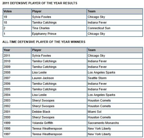 Galatasaray Kulübü'nün internet sitesinden yapılan açıklamada, Sylvia Fowles'ın kullanılan 40 oyun 19'unu alarak, Indiana Fever'dan Tamika Cathings, Connecticut Sun'dan Tina Charles ve Chicago Sky'dan takım arkadaşı Epiphanny Prince'i geride bırakarak en iyi savunmacı seçildiği belirtildi.