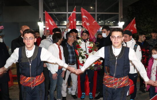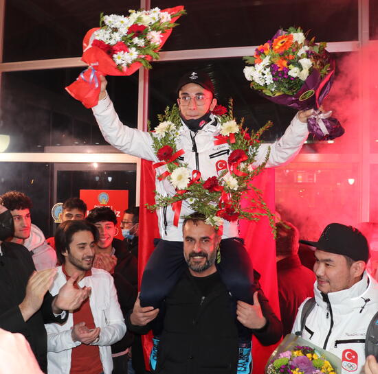 Çin'den İstanbul aktarmalı olarak memleketine gelen Furkan, Erzurum Havalimanı'nda Gençlik ve Spor İl Müdürü Birdal Öztürk, ailesi, yakınları ve arkadaşları tarafından çiçeklerle karşılandı.