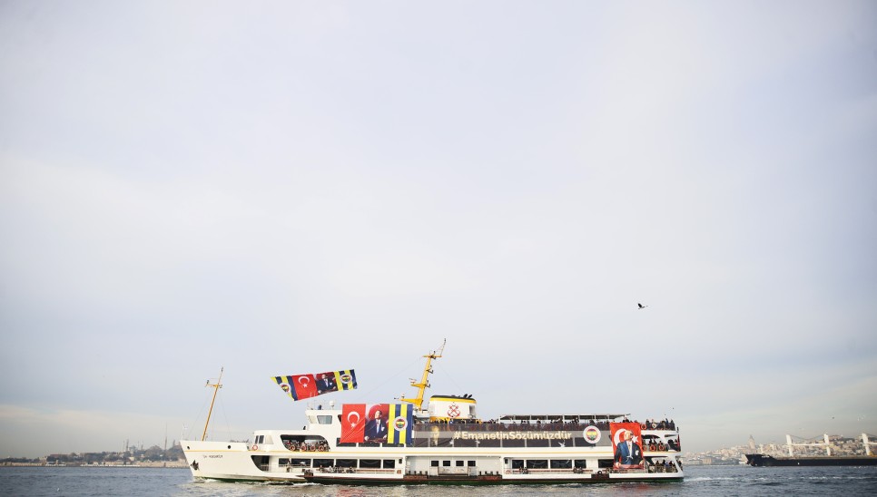 Türk bayrakları, Fenerbahçe bayrakları ve Atatürk portresiyle donatılan vapur, Kadıköy'deki Eminönü-Karaköy Şehir Hatları İskelesi'nden Dolmabahçe Sarayı'na doğru hareket etti.
