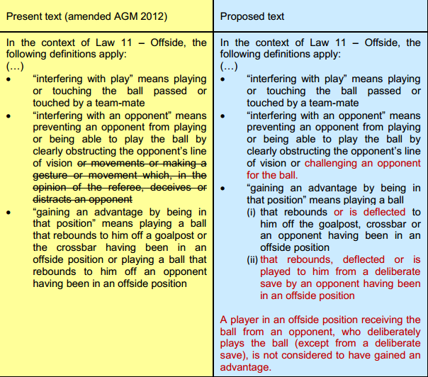 Buna göre; artık 'rakibin kurtardığı' toplar da ilk anda ofsayt bölgesinde bulunan bir oyuncu ile buluşursa, ofsayt olarak değerlendirilecek. Ayrıca buna ek olarak, eğer rakip kurtardığı topu kontrol etme çabasında bulunursa, ilk durumda ofsaytta bulunan oyuncu topa hareketlenebilecek ve bu pozisyon ofsayt olarak değerlendirilmeyecek.Bir diğer yenilik ise ofsaytın 'rakip ile etkileşime geçmek' bölümünde yapıldı. Eski kurala göre, eğer bir takımın oyuncusu şut çekildiği sırada ofsayt pozisyonunda yer alıyorsa, top ile etkileşime geçmemesi durumunda bile rakibin dikkatini dağıtması nedeniyle takımı ofsayt ile cezalandırılıyordu. Yapılan yenilik sonrasında, rakibi ile top için bir mücadeleye girmeyen oyuncunun ofsaytta sayılmamasına karar verildi.