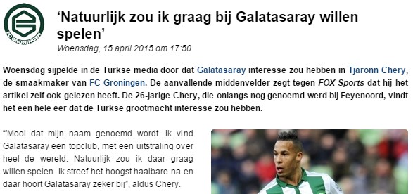 -SPORX DIŞ HABERLER- Galatasaray'da yabancı sınırlamasının serbest kalmasının ardından gözlemciler Avrupa piyasasındaki çalışmalarını sürdürürken, gündeme gelen Groningen'li Tjaronn Chery flaş bir açıklamada bulundu.