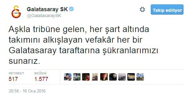 Galatasaray Kulübü, Medicana Sivasspor'u 3 - 1 yendikleri maçın ardından Twitter'dan taraftar için teşekkür mesajı yayınladı.