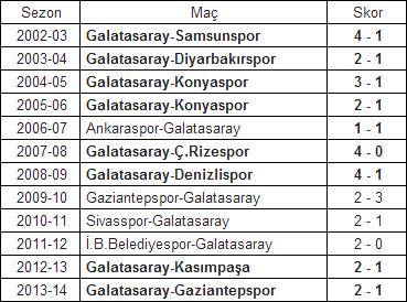 Galatasaray, evsahibi olduğu son 8 ilk hafta maçında galibiyet aldı. Ali Sami Yen Spor Kompleksi Türk Telekom Arena Stadı'nda son 2 sezonda açılış maçlarını Kasımpaşa ve Gaziantepspor karşısında 2-1 kazanan Galatasaray, 2008-09 sezonunda Denizlispor’u 4-1, 2007-08 sezonunda Çaykur Rizespor’u 4-0, 2005-06 sezonunda Konyaspor’u 2-1, 2004-05 sezonunda Konyaspor’u 3-1, 2003-04 sezonunda Diyarbakırspor’u 2-1 ve 2002-03 sezonunda Samsunspor’u 4-1 mağlup etti.